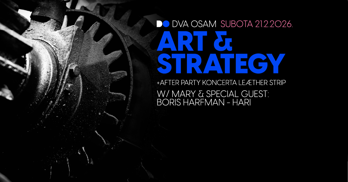 Novi Art & Strategy čeka nas u subotu 21. 2. u klubu DVA OSAM u sklopu tjednog EBM Daya koji će ujedno biti i Leæther Strip after party, jer tog dana održava se njegov prvi koncert u Zagrebu. Za ovu specijalnu prigodu uz rezidenta Maryja gostovat će Boris Harfman – Hari iz Danse Macabre koji će Vas zajedno provesti kroz zvukove plesnog EBM-a, Industriala i Dark electra.