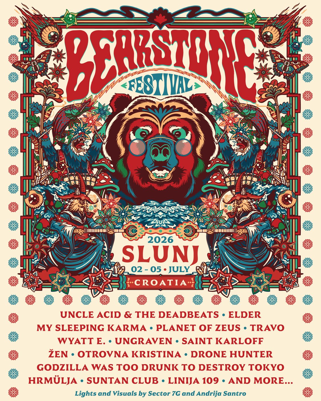 Od okultno obojene psihodelije Uncle Acid & The Deadbeats i progresivne snage Eldera, do meditativnih zvučnih pejzaža My Sleeping Karma, visokonaponskog rocka Planet of Zeus i sirove underground energije izvođača kao što su TRAVO, ŽEN, Otrovna Kristina, Wyatt E. i mnogi drugi, račun savršeno odražava predanost Bear Stone Festivala glazbenoj raznolikosti.