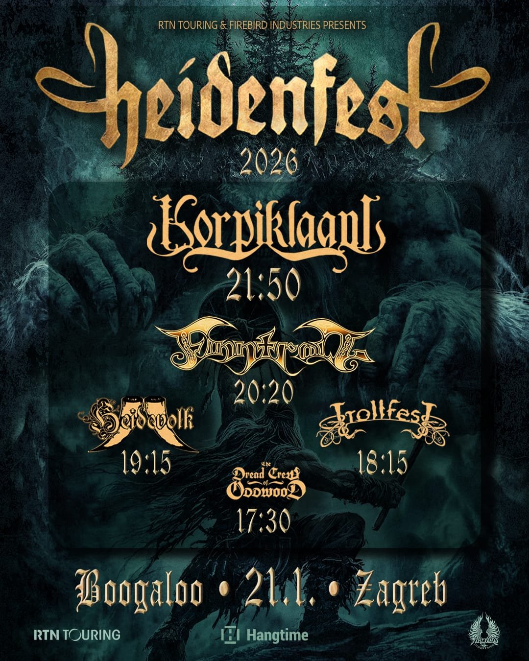 Dugoiščekivani premijerni dolazak Heidenfesta u Hrvatsku napokon će se dogoditi ovu srijedu (21.1.) u zagrebačkom Boogaloou. Čak pet bendova nastupit će tom prilikom: Korpiklaani, Finntroll, Heidevolk, Trollfest i The Dread Crew of Oddwood. Festival je to u kojem i publika daje snažan obol, očekuje se velik broj kostimiranih posjetitelja: od vila i trolova preko Vikinga do gusara. Pretprodajna cijena ulaznica za ovaj izuzetni metal spektakl je 45 eura i mogu se nabaviti preko Hangtime weba i u Dirty Old Shopu, na dan će koštati 50 eura. Link: https://bit.ly/4mBTrRE