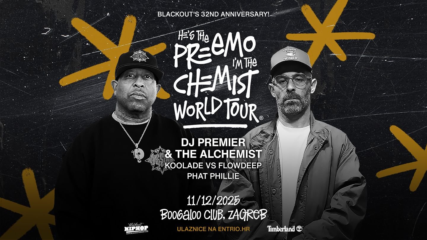 Dva sjajna domaća producenta koji su zlatnim slovima upisani u povijest hrvatskog hip-hopa, Koolade i Flowdeep (TDKM), pridružit će se DJ Premieru i The Alchemistu u Boogaloou u četvrtak 11. prosinca na proslavi Blackoutovog 32. rođendana. Domaćin i Blackout slavljenik Phat Phillie također će svojim setom zagrijati publiku tako da su svi sastojci tu za jednu fantastičnu i nezaboravnu hip-hop večer. Trenutačna cijena ulaznica je 42 eura, mogu se kupiti preko sustava Entrio te na svim njihovim prodajnim mjestima. Early bird ulaznice su rasprodane.
